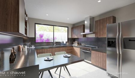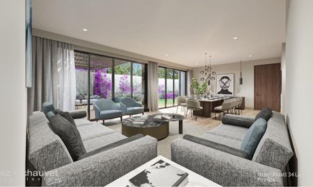 Area de construcción 408.49 m2, nivel planta baja con sala, comedor, cocina con amplia alacena, family room, baño para visitas, pérgola con cristal en terraza (28 m2), jardín privado (75 m2), pérgola (15 m2) en estacionamiento.