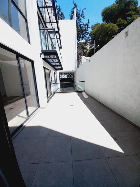 cuenta con amplia sala, comedor con mucha luz y salida al patio/Terraza, cocina integral equipada con vista al patio, área de lavado, 2 recámaras, la principal con vestidor y baño completo, un baño completo adicional, y medio baño en área social, Terraza de 24.6 m2 y 2 estacionamientos que no se estorban con vecinos y 1 bodega en área de estacionamiento
